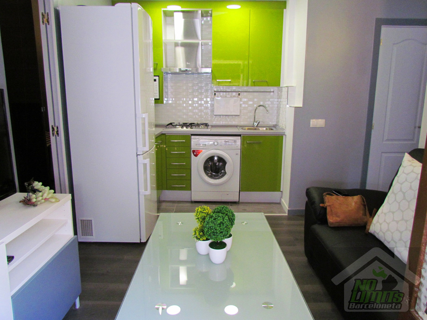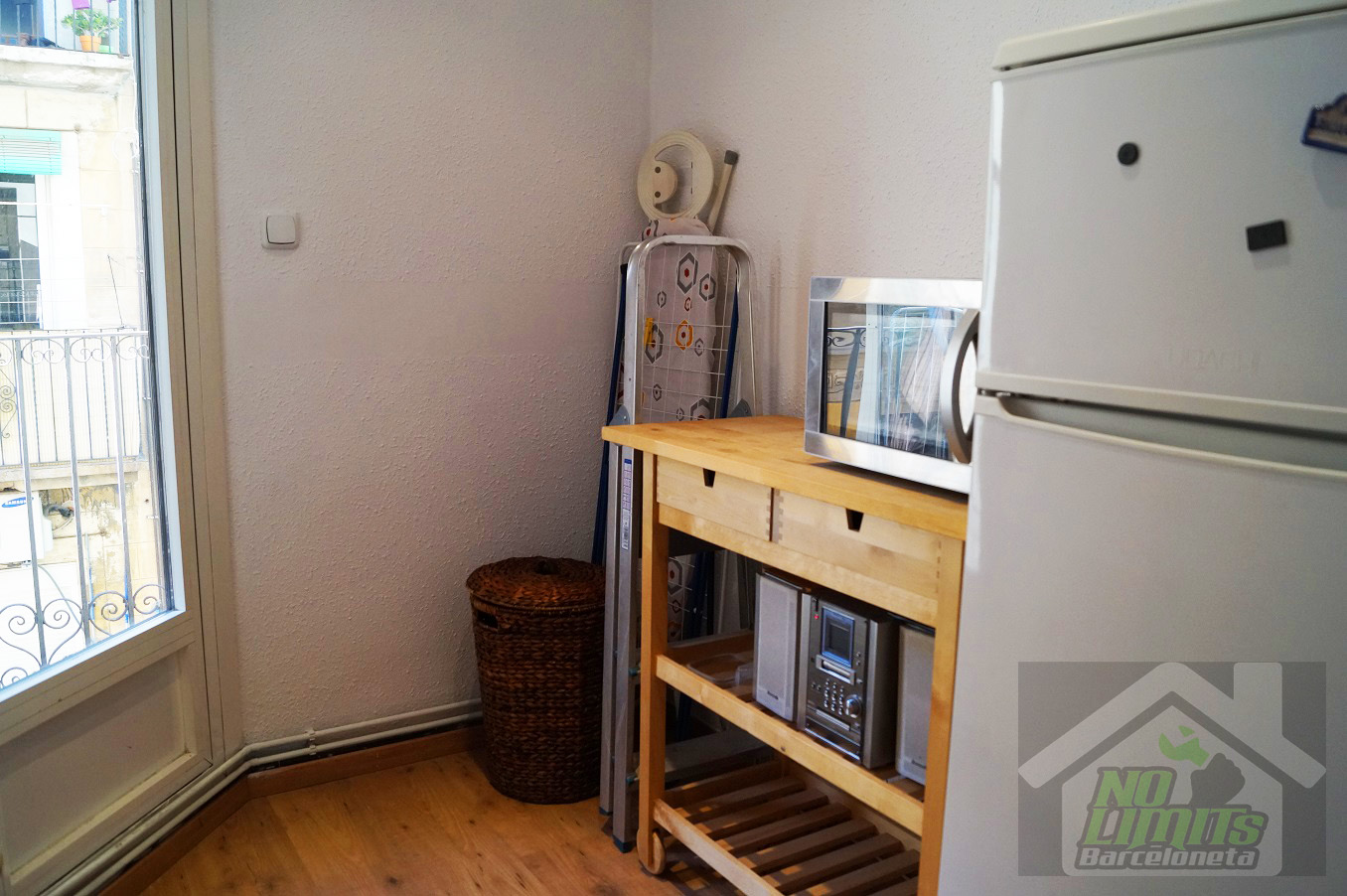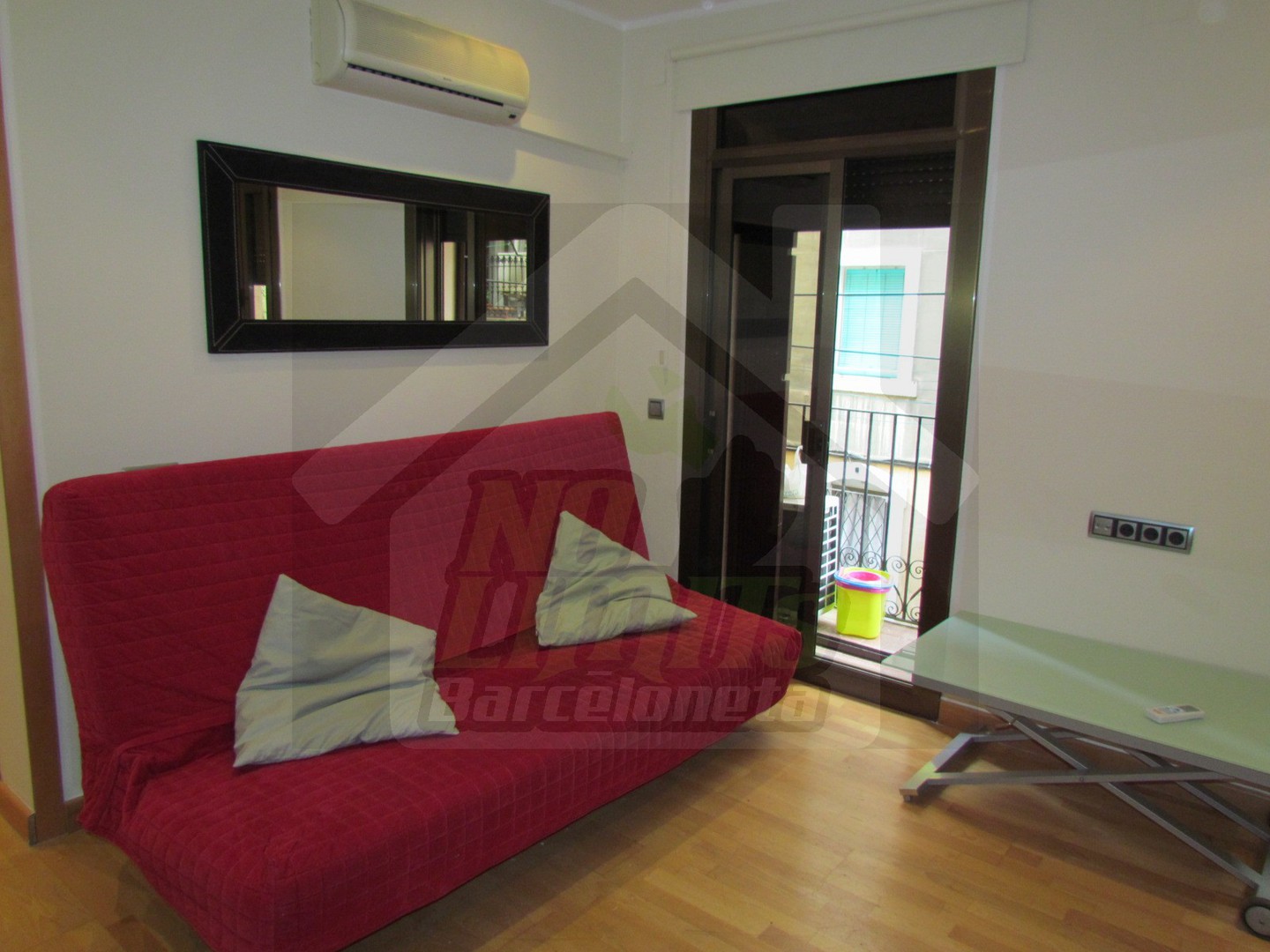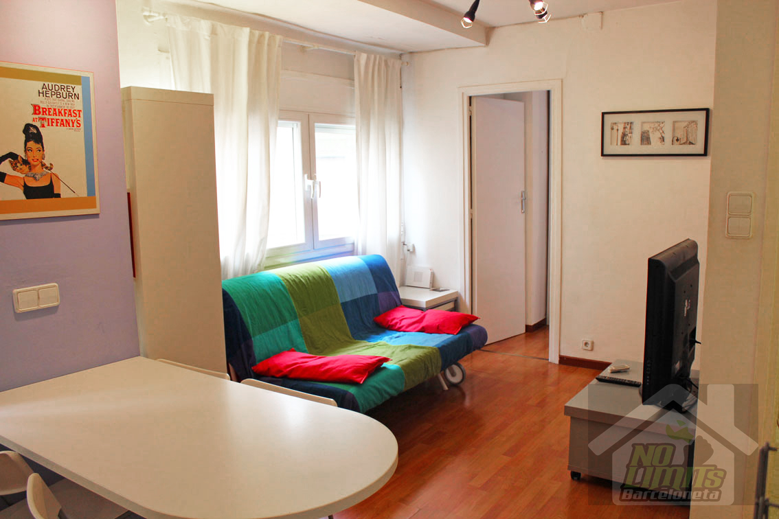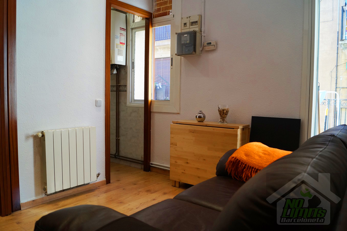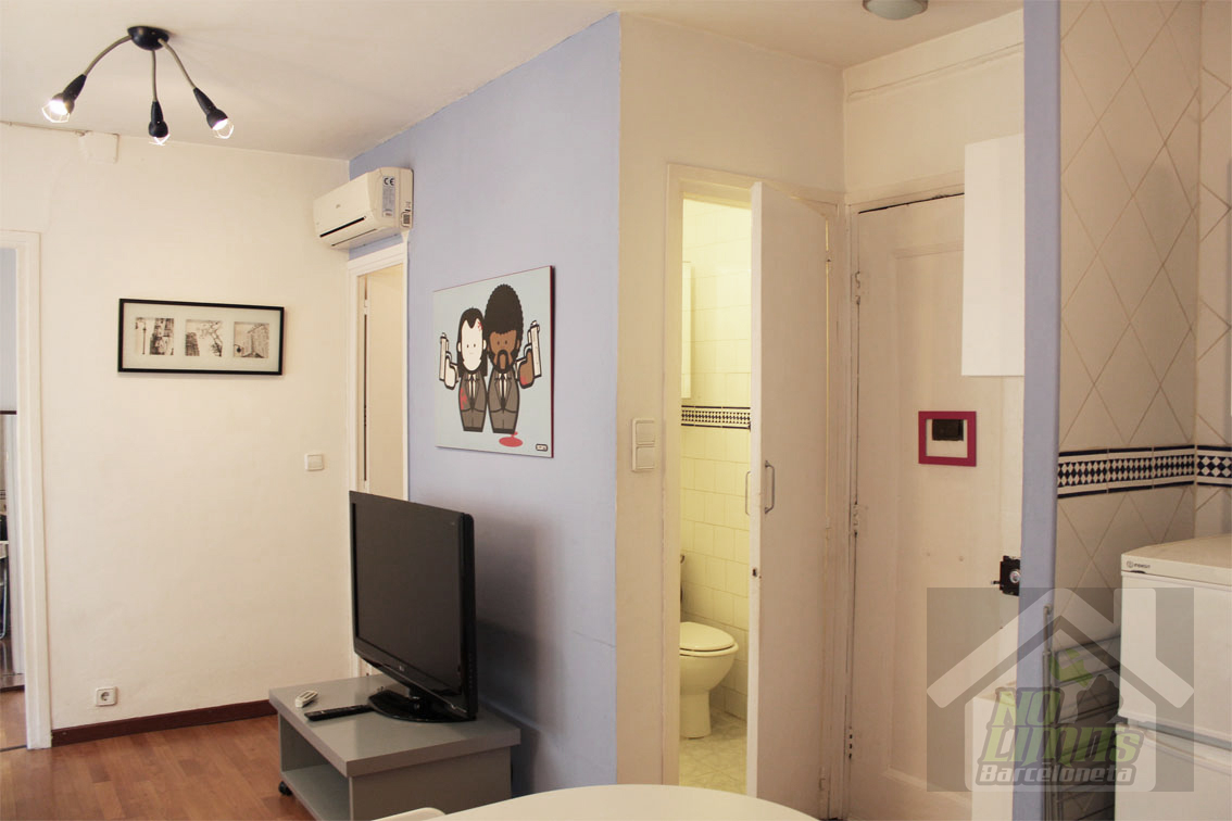 Good flat with 1 double room located near the Barceloneta Market, with all kind off shops and services around. American kitchen, totally equipped (including oven and dishwasher). Saloon with sofa bed, a/c and TV. Bathroom is in good shape. Small room with laundry machine and cleaning accessories. 4th floor without elevator.