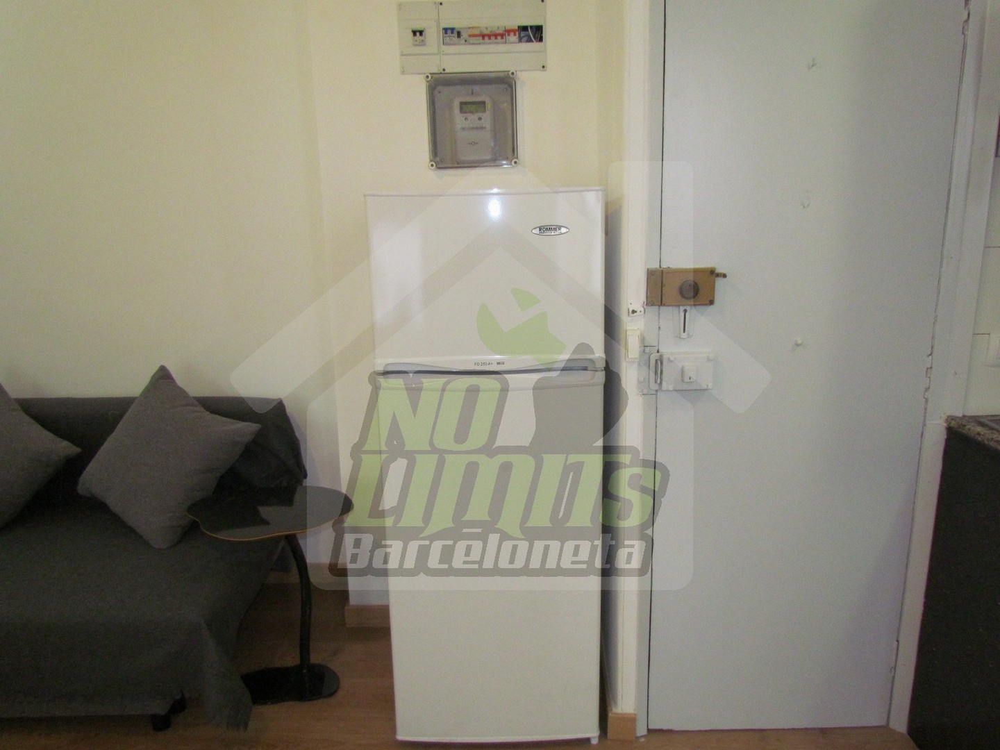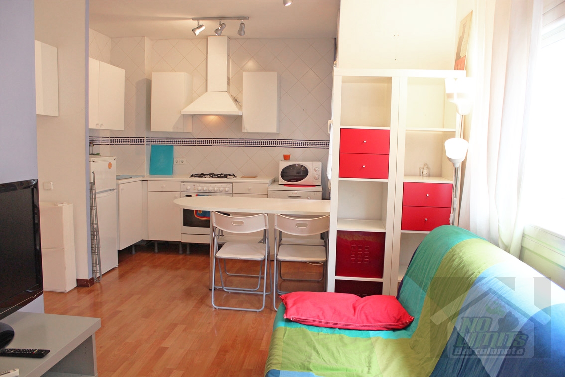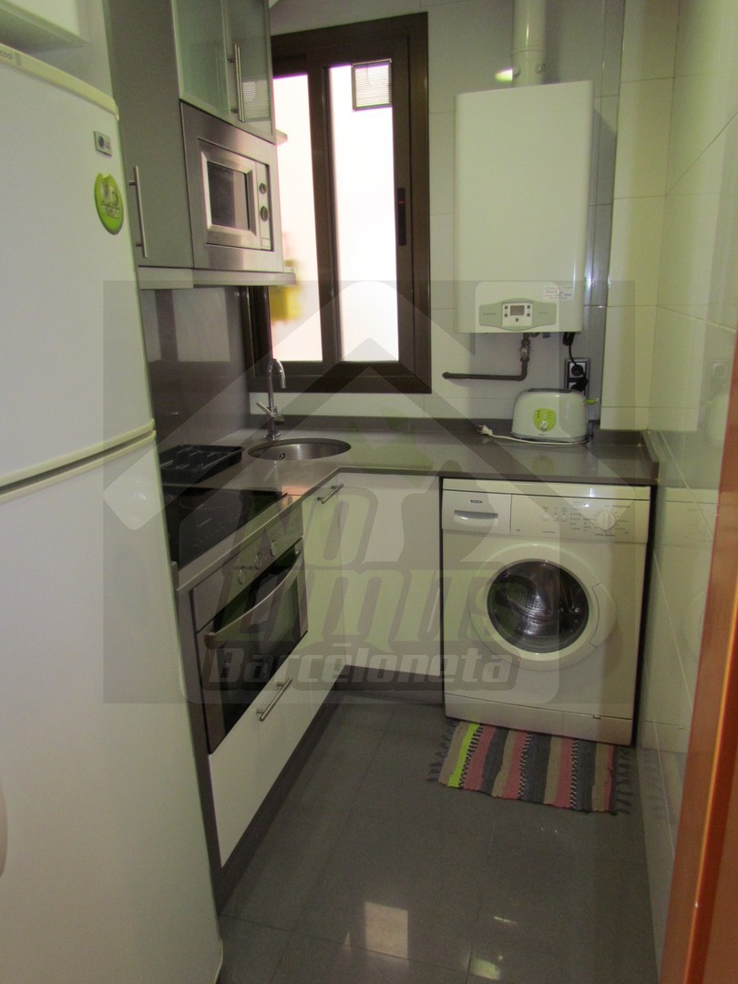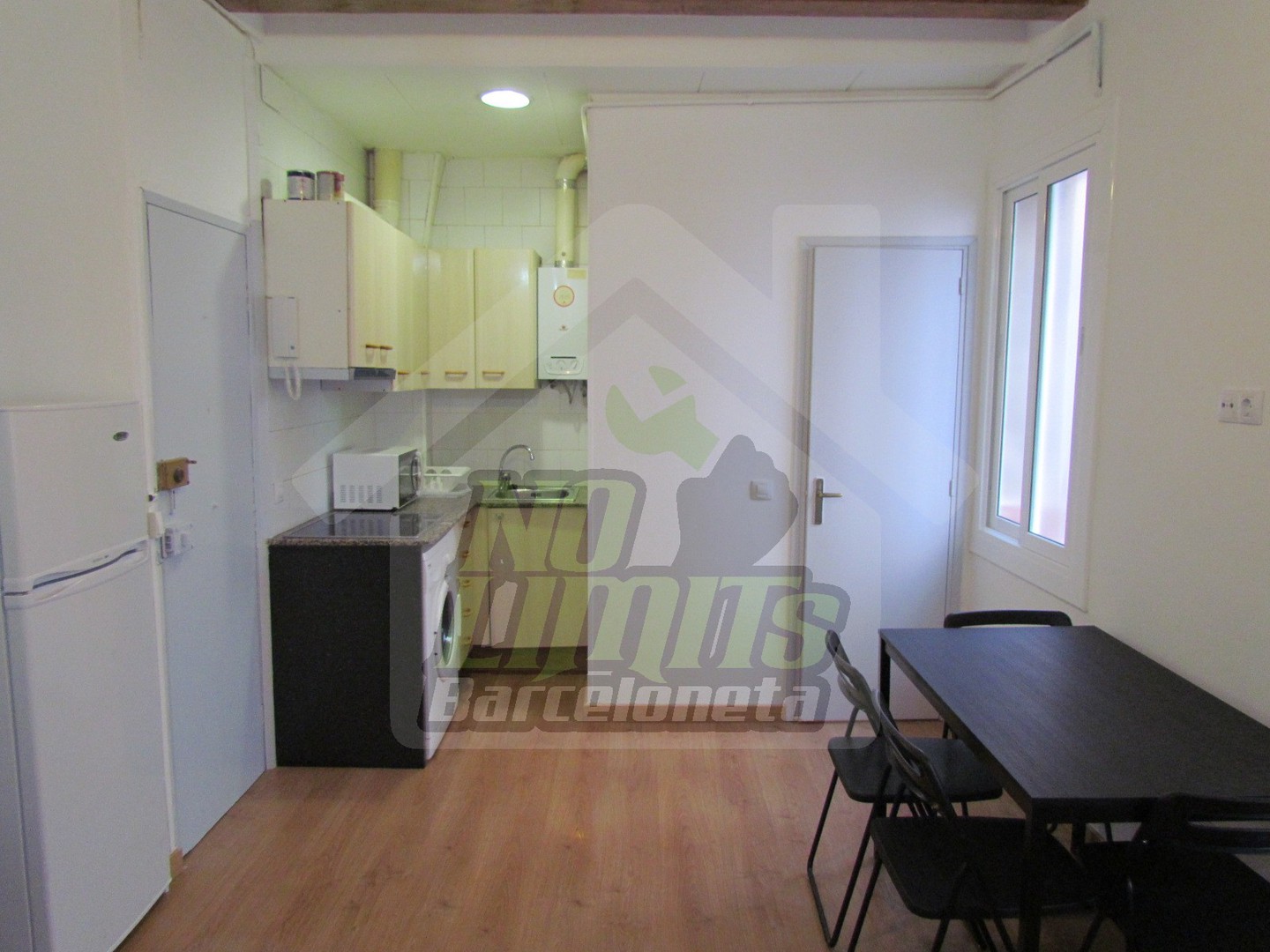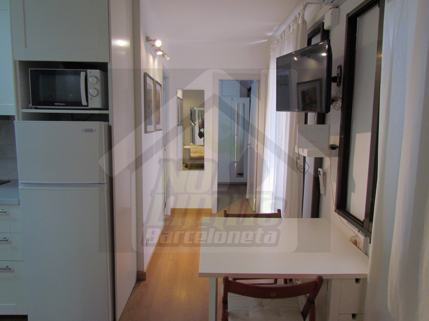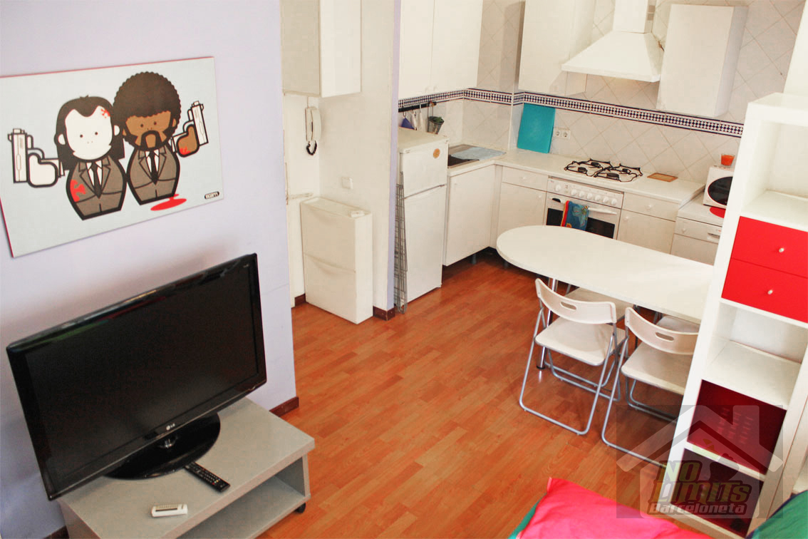 Good flat with 1 double room located near the Barceloneta Market, with all kind off shops and services around. American kitchen, totally equipped (including oven and dishwasher). Saloon with sofa bed, a/c and TV. Bathroom is in good shape. Small room with laundry machine and cleaning accessories. 4th floor without elevator.
