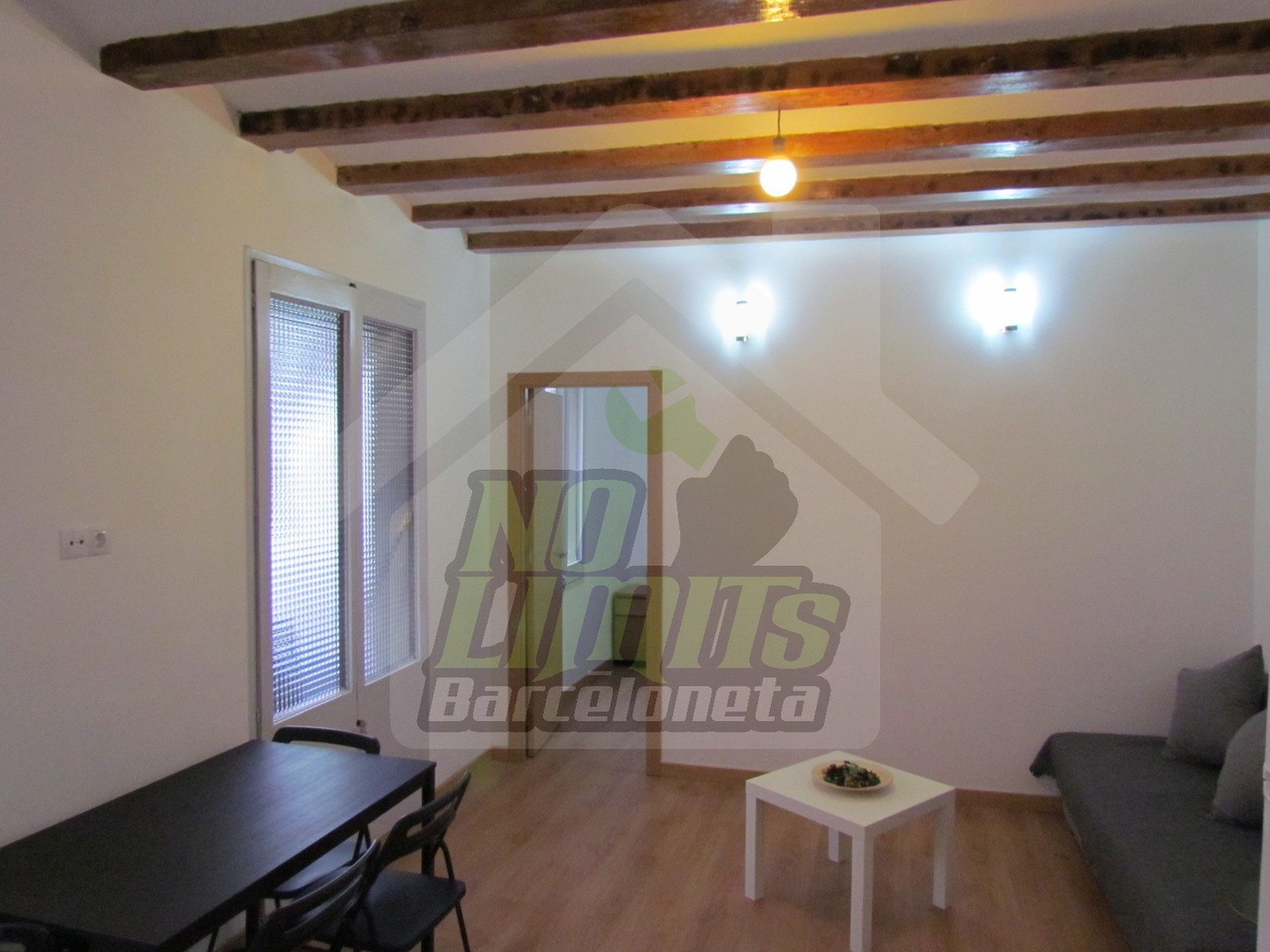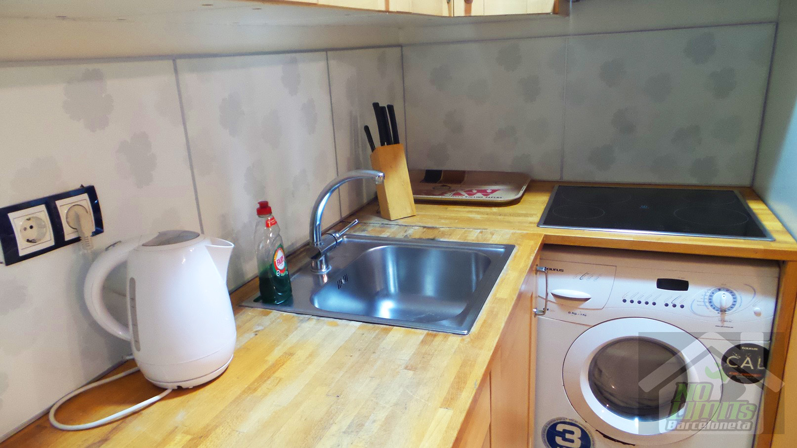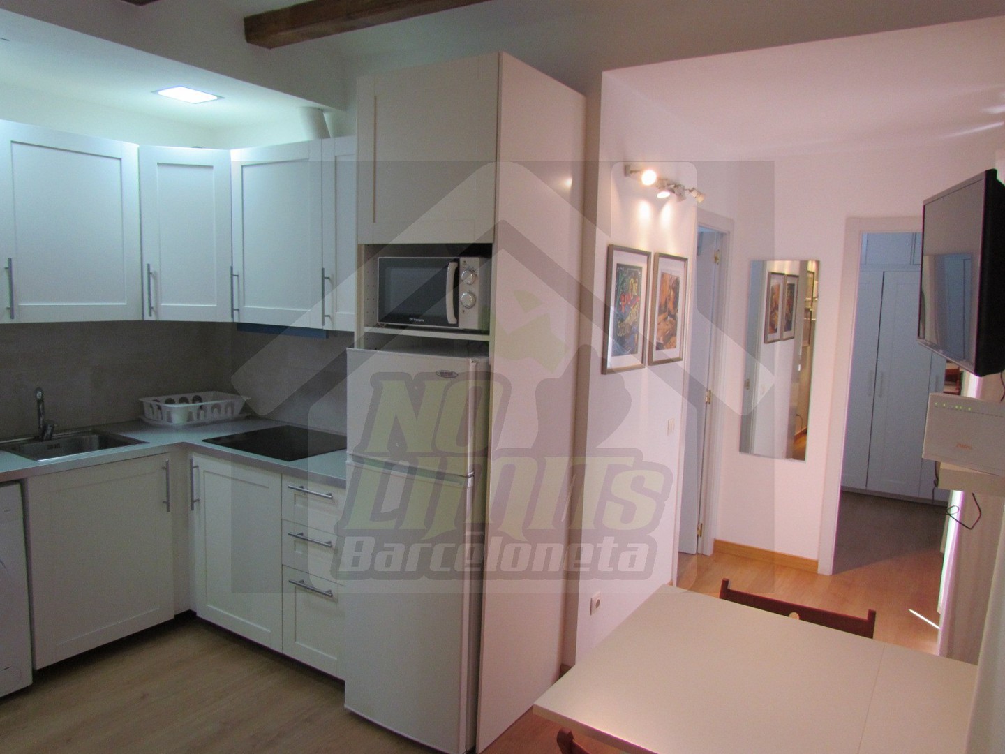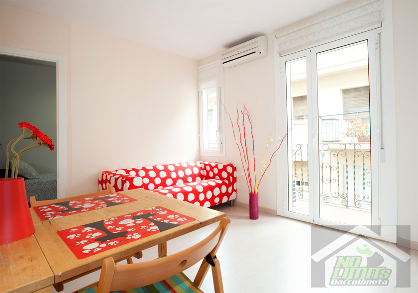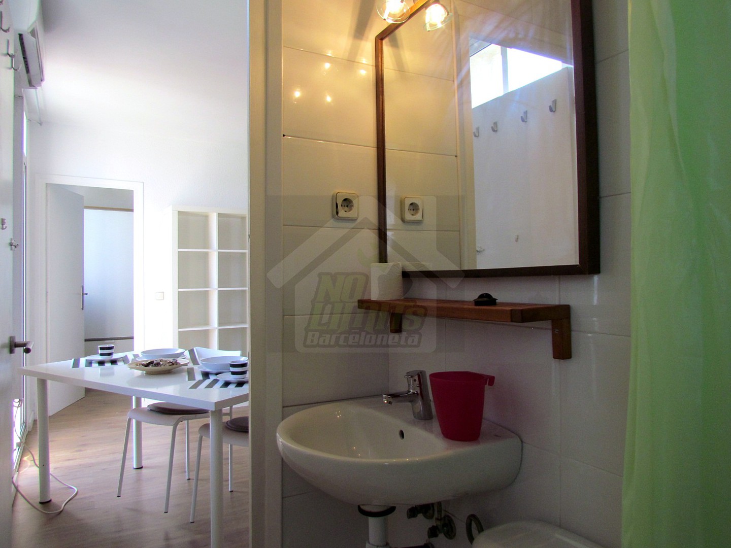 Good flat with 1 double room located near the Barceloneta Market, with all kind off shops and services around. American kitchen, totally equipped (including oven and dishwasher). Saloon with sofa bed, a/c and TV. Bathroom is in good shape. Small room with laundry machine and cleaning accessories. 4th floor without elevator.