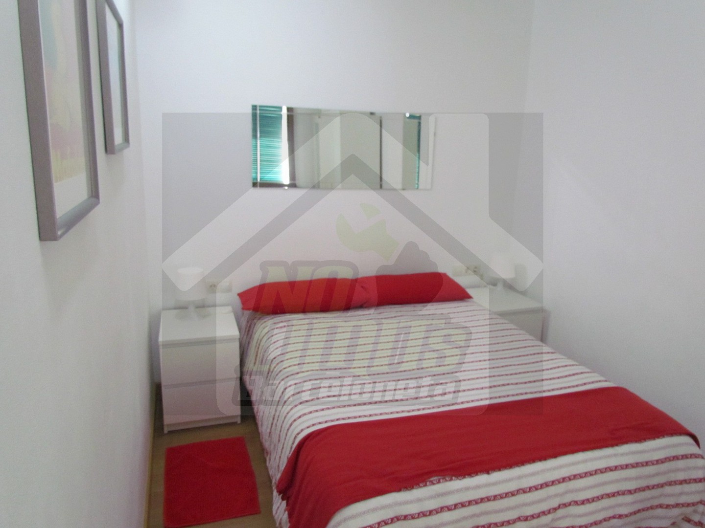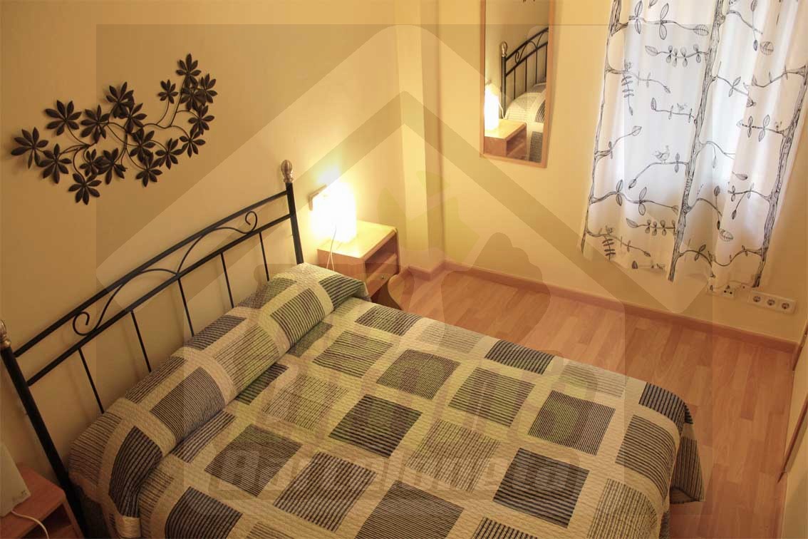 Bonito piso de dos habitaciones: una doble y otra individual. Habitación principal doble con cama y amplio armario. La habitación pequeña cuenta con cama individual y un pequeño armario. Ambas con ventana. Salón comedor con sofá, mesa para 4, aire acondicionado y cocina americana con electrodomésticos. Pequeño balcón. Mucha luz y ventilación .