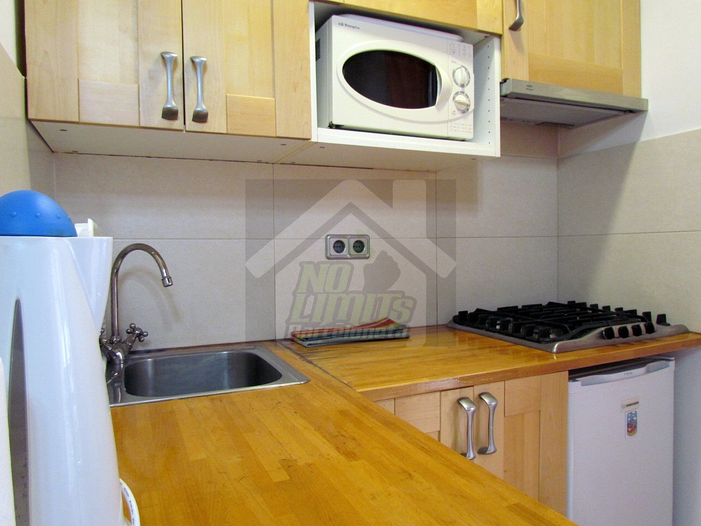 One room apartment totally equipped with double bed, big closet and accessory furniture. Dining room with table for 2-6 people, sofa, TV, and access to small balcony. Separated kitchen with appliances, including oven and microwave. Bathroom in good shape.