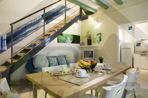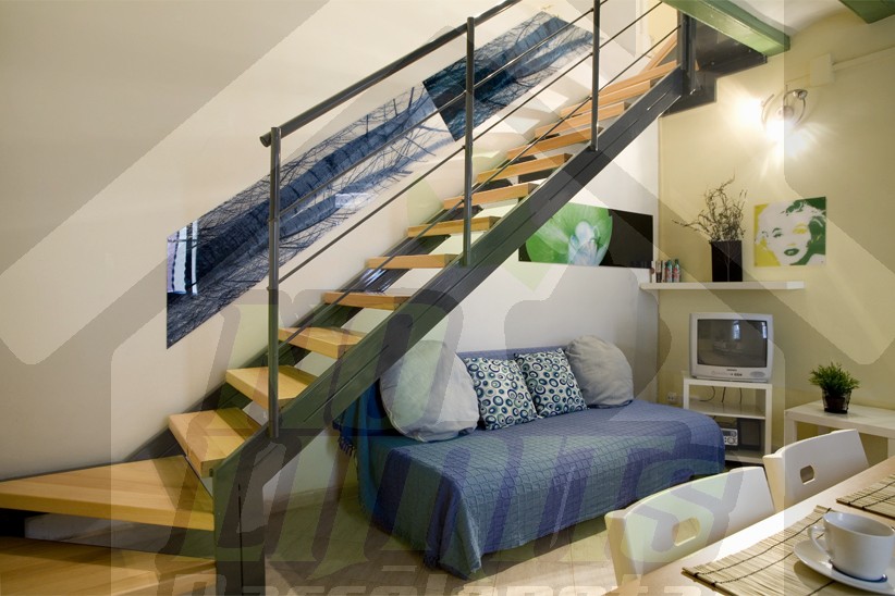 Beautiful duplex, located on street level of a quiet Street. Upper floor: double bedroom, completely furnished; second room with 2 single beds; bathroom in very good shape; small balcony to the street. Lower level: American kitchen with appliances; integrated saloon with sofa, table for 6 and other furniture.